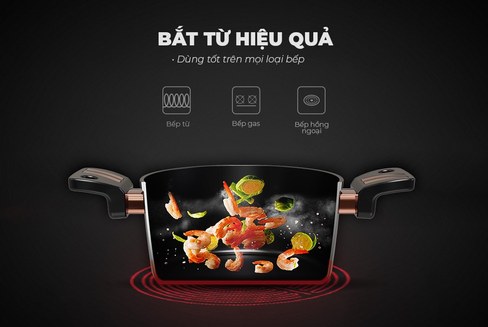 Đáy nồi có khả năng bắt từ, bắt nhiệt tốt, có thể sử đụng được trên mọi loại bếp khác nhau như bếp từ, bếp gas hay bếp hồng ngoại, phù hợp với căn bếp của mọi gia đình.