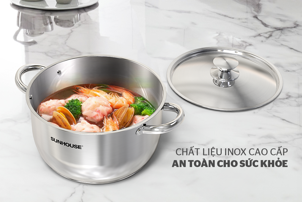 Với ưu điểm của chất liệu inox cao cấp là không bị oxy hoá, không han gỉ, không bị oxy hóa nên rất an toàn cho sức khoẻ. Bạn hoàn toàn yên tâm sử dụng bộ nồi SUNHOUSE SHG302 lâu dài để chế biến thật nhiều món ăn ngon cho gia đình.