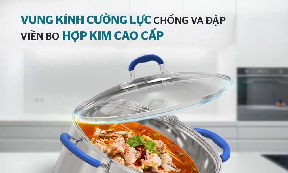 Sự kết hợp giữa kính cường lực và viền bo hợp kim cao cấp không chỉ làm tăng tính thẩm mỹ mà còn đảm bảo độ an toàn và độ bền cho sản phẩm. Mặt vung trong suốt giúp bạn dễ dàng quan sát thực phẩm trong quá trình nấu nướng.