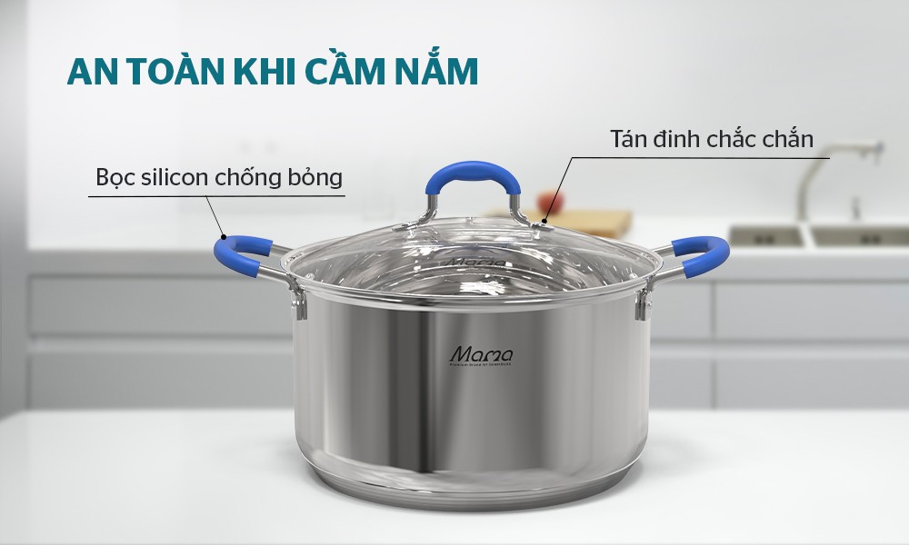 An toàn và thoải mái hơn khi sử dụng nhờ thiết kế quai núm và tay cầm bọc silicon của BỘ NỒI CHẢO INOX 5 ĐÁY SUNHOUSE MAMA SHG509. Nồi được tán đinh chắc chắn, bạn có thể dễ dàng thao tác với nồi mà không sợ bị bỏng tay.