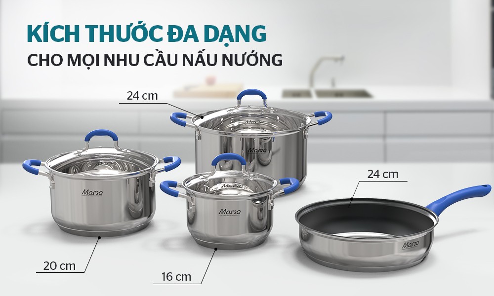 Kích thước: Đường kính lòng nồi 16 - 20 - 24cm và lòng chảo 24cm