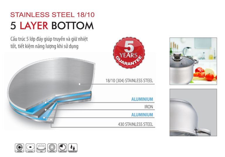 - Lớp phía trong cùng là lớp động chạm trực tiếp với món ăn được làm bởi hợp kim duy nhất an toàn là inox 304 hay còn gọi là thép 18/10 được khẳng định là hợp kim inox an toàn nhất, inox 304 với đặc tính là không bị tác động và chống bị mòn cao. Vật liệu này không bị thôi ra các chất độc hại, không tạo tác với thực phẩm, không gây ra các độc chất không có lợi đem lại cho sức khỏe khi mọi người sài đồ nấu nướng từ nó. Không chỉ vậy thực phẩm còn giữ gìn hàm lượng dưỡng chất cần thiết gửi đến cơ thể.