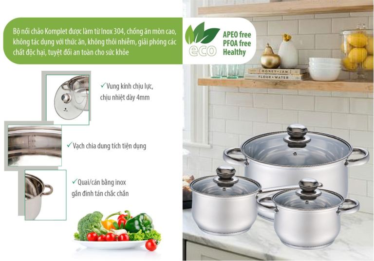 - Mỗi khi sử dụng bộ nồi inox Elmich Komplet EL3112 để nấu ăn món ăn sẽ chín đồng thời, giữ được như cũ các vitamin và khoáng chất. Chắc rằng các chị em sẽ khiến cho chồng và con cảm thấy thú vị các thực phẩm người mẹ người vợ nấu ăn trong nhà.