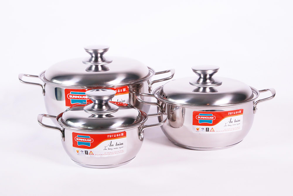 Bộ nồi inox 3 đáy SUNHOUSE SH335 sử dụng được với mọi loại bếp, kể cả bếp từ. Bộ sản phẩm gồm 3 nồi với đường kính 16cm - 20cm - 24cm phù hợp với nhu cầu nấu nướng của mọi gia đình. Nồi nhỏ 16cm thích hợp để luộc trứng, kho thịt, nồi cỡ trung 20cm để nấu canh cho 2-4 người và nồi lớn 24cm có thể luộc gà, nấu canh hoặc lẩu cho 3-5 người.