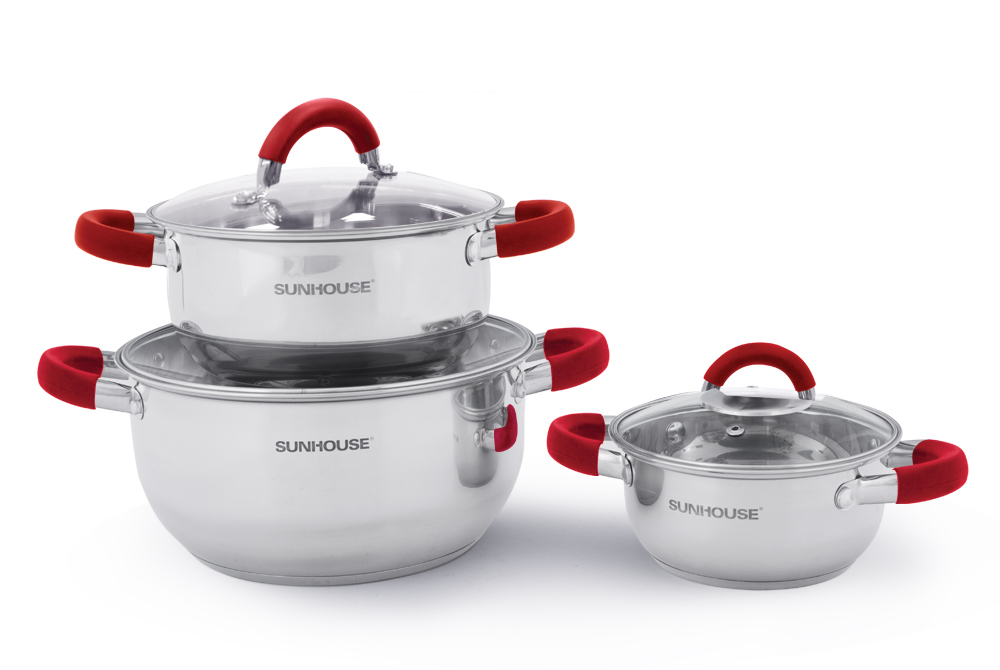 Bộ nồi inox 3 đáy SUNHOUSE SHG2303MRA được làm bằng chất liệu inox chất lượng, an toàn sức khỏe. Không chỉ đẹp về kiểu dáng, bộ nồi còn được chăm chút từng chi tiết như vung kính cường lực viền inox chắc chắn, quai núm bọc silicon cách nhiệt hiệu quả. Bộ sản phẩm bao gồm 03 nồi với 3 kích cỡ 16 – 20 – 24cm, đáp ứng đa dạng nhu cầu nấu nướng tại gia đình.
