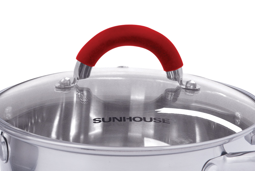 Bộ nồi inox 3 đáy SUNHOUSE SHG2303MRA được trang bị vung kính cường lực, trong suốt, giúp bạn dễ dàng quan sát thực phẩm trong nồi khi nấu nướng. Viền mép vung bọc inox chắc chắn, hạn chế bể vỡ khi va đập. Núm cầm inox bọc silicon cách nhiệt hiệu quả, chống bỏng.