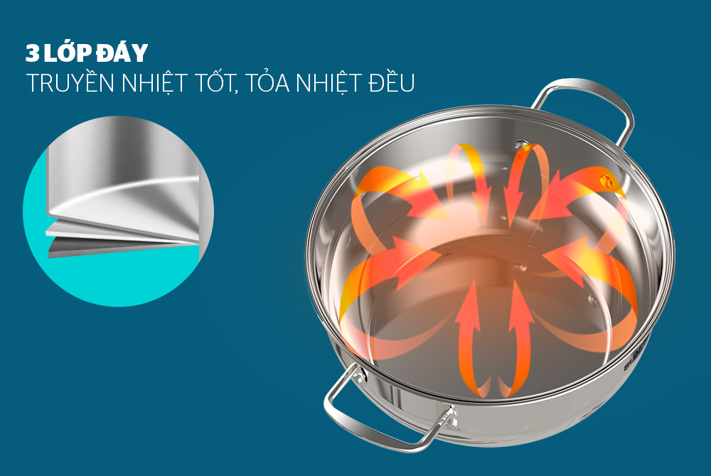 - 3 lớp đáy truyền nhiệt nhanh, tỏa nhiệt đều