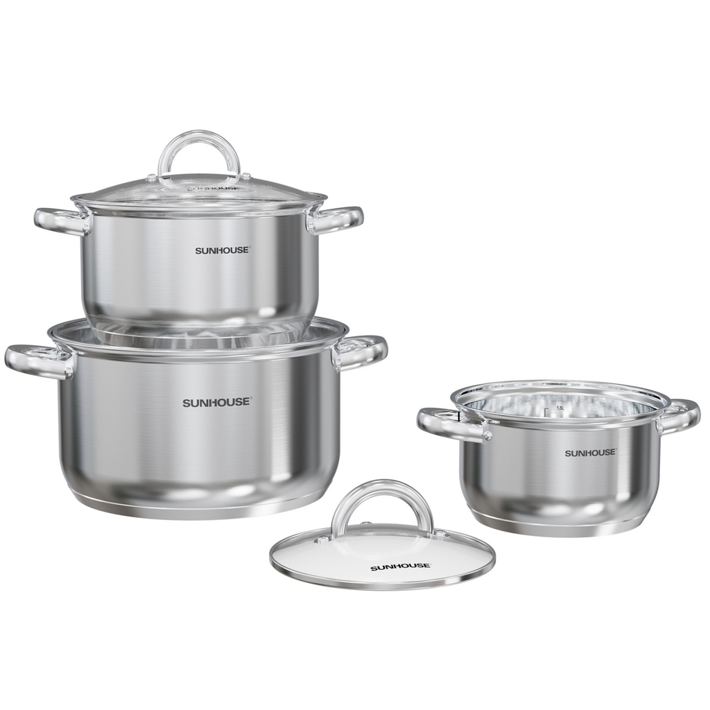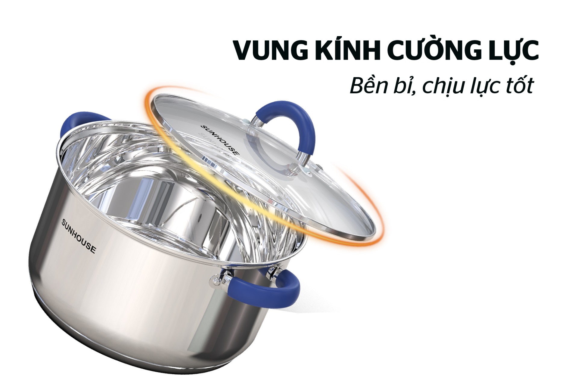 Bộ nồi được trang bị vung kính cường lực viên Inox chắc chắn, hạn chế nứt vỡ, trầy xước khi va đập. Vung kính trong suốt, sáng bóng giúp bạn dễ dàng quan sát thực phẩm trong quá trình nấu nướng.