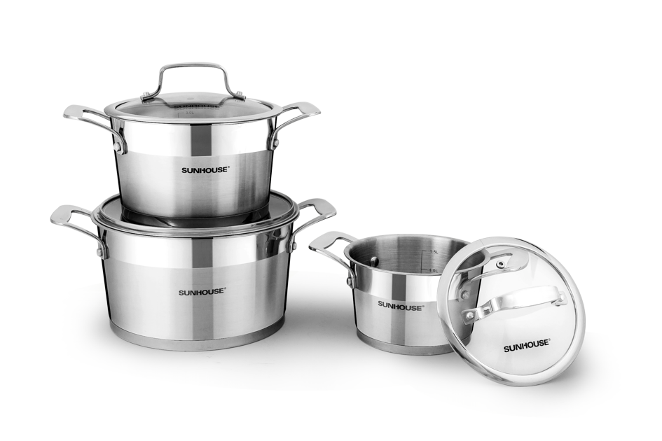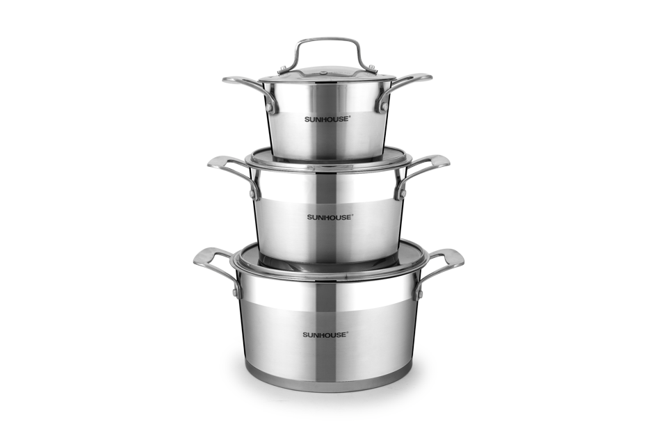 Bộ nồi inox 5 đáy SUNHOUSE SH779 sử dụng được với mọi loại bếp, kể cả bếp từ. Bộ sản phẩm gồm 3 nồi với đường kính 16cm - 20cm - 24cm phù hợp với nhu cầu nấu nướng của mọi gia đình. Nồi nhỏ 16cm thích hợp để luộc trứng, kho thịt, nồi cỡ trung 20cm để nấu canh cho 2-4 người và nồi lớn 24cm có thể luộc gà, nấu canh hoặc lẩu cho 3-5 người.