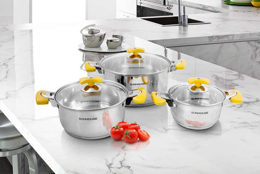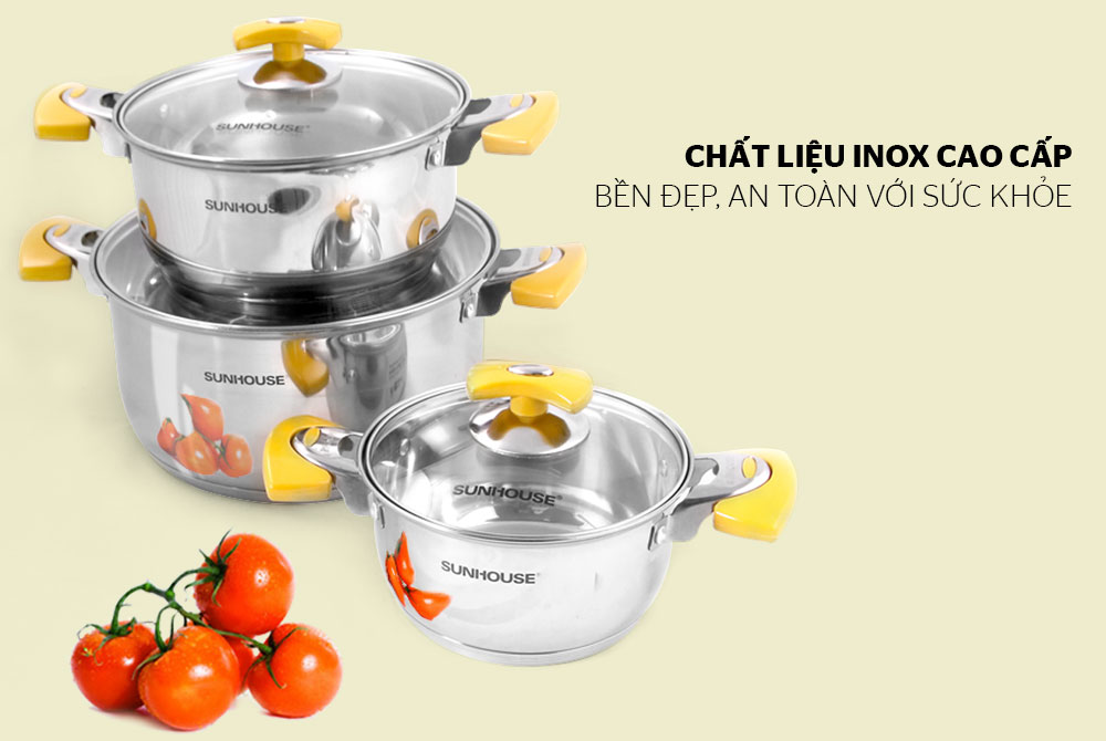 Với quai núm được chế tạo từ inox, bọc nhựa màu vàng, bộ nồi inox SUNHOUSE SH787 càng trở nên nổi bật. Đặc biệt, quai núm được thiết kế to bản, tán đinh chắc chắn, cách nhiệt tốt nên bạn rất dễ cầm và di chuyển trong quá trình sử dụng.