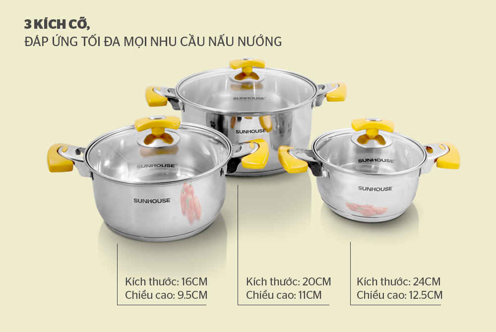 Bộ nồi inox 5 đáy SUNHOUSE SH787 sử dụng được với mọi loại bếp, kể cả bếp từ. Bộ sản phẩm gồm 3 nồi với đường kính 16cm - 20cm - 24cm phù hợp với nhu cầu nấu nướng của mọi gia đình. Nồi nhỏ 16cm thích hợp để luộc trứng, kho thịt, nồi cỡ trung 20cm để nấu canh cho 2-4 người và nồi lớn 24cm có thể luộc gà, nấu canh hoặc lẩu cho 3-5 người.