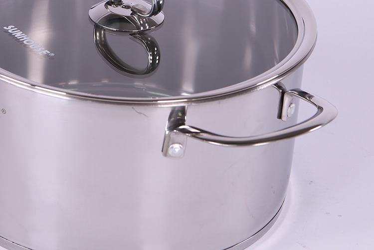 Bộ nồi inox 5 đáy SUNHOUSE SH890 được trang bị vung kính cường lực, trong suốt giúp bạn dễ dàng quan sát thực phẩm bên trong nồi. Viền mép vung được bọc inox, vừa sang trọng, vừa hạn chế bể vỡ khi va đập.