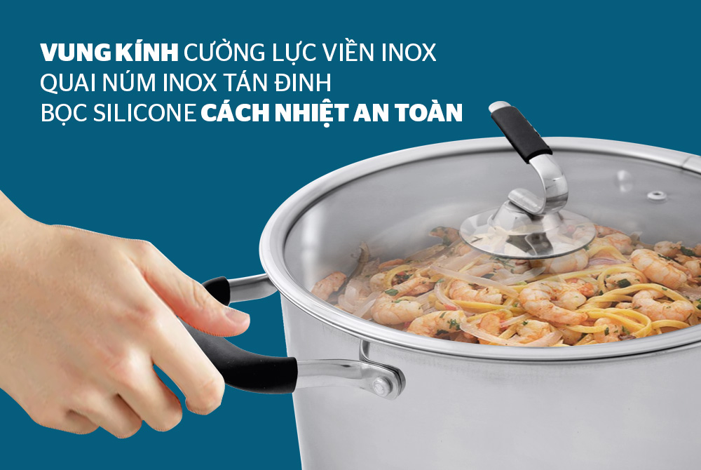 Sản phẩm được trang bị vung kính cường lực, trong suốt giúp bạn dễ dàng quan sát thực phẩm bên trong nồi. Viền mép vung được bọc inox, vừa sang trọng, vừa hạn chế bể vỡ khi va đập.