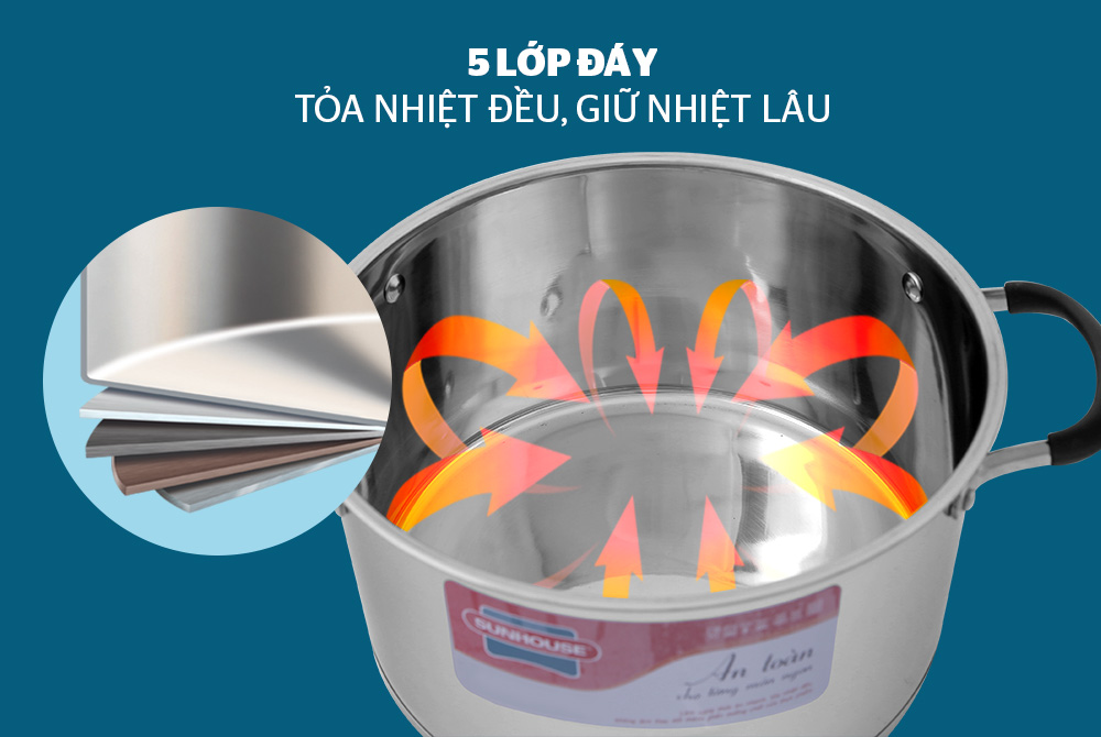 Bộ nồi inox 5 đáy SUNHOUSE SH891 có cấu tạo 5 lớp đáy dày dặn, giúp nhiệt lượng tỏa đều khắp đáy, thức ăn chín ngon, giảm cháy khét hiệu quả.