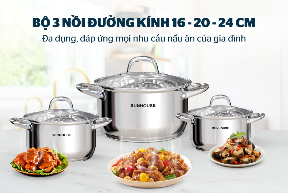 Bộ sản phẩm gồm 3 nồi với đường kính 16, 20 và 24 cm phù hợp với nhu cầu nấu nướng của mọi gia đình. Nồi cỡ nhỏ để kho thịt, luộc trứng và nấu lượng thức ăn cho 1 – 2 người; nồi vừa 20 cm để nấu canh cho 2 – 4 người và nồi lớn 24 cm có thể luộc gà, nấu canh hoặc lẩu cho 3 – 5 người.