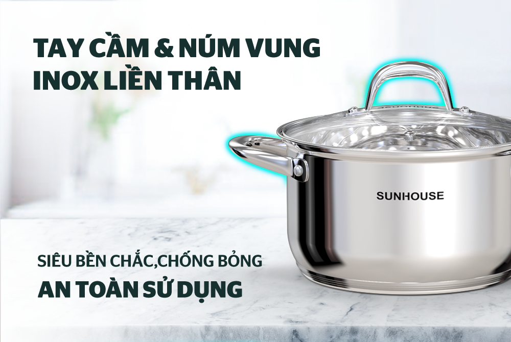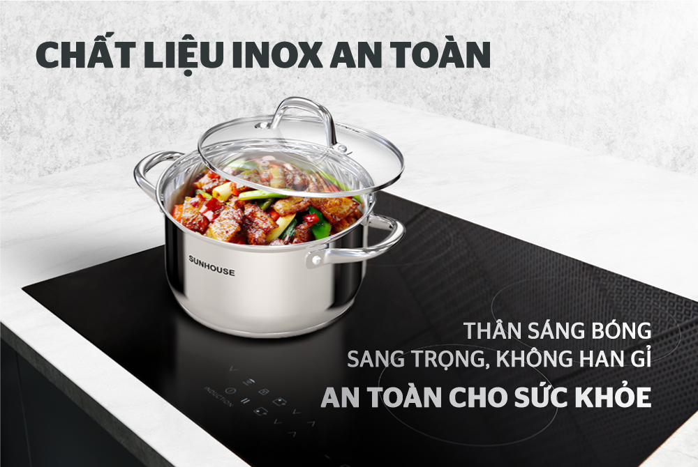 Bộ nồi inox 5 đáy SUNHOUSE SHG517 được làm từ chất liệu inox cao cấp với thiết kế 5 lớp đáy giúp tỏa nhiệt đều và tăng khả năng giữ nhiệt. Ngoài ra, nhờ kết cấu đáy dày nên hạn chế được tình trạng cháy khét.