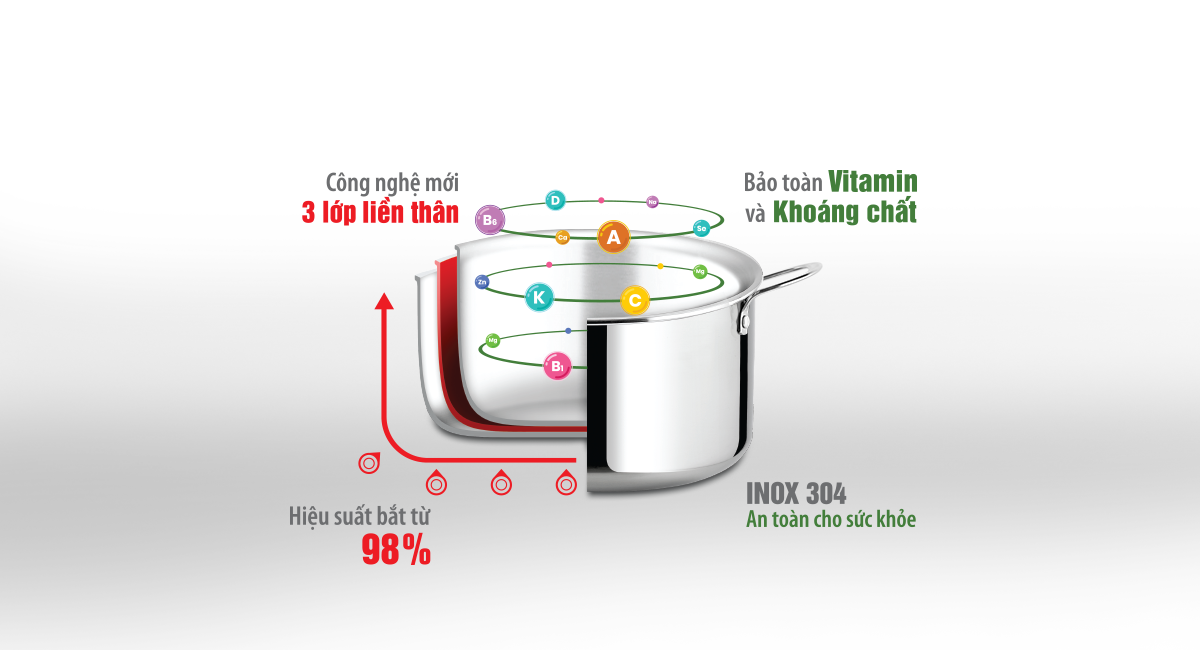 Thực phẩm được làm nóng từ cả thành và đáy mà không lo bị cháy hay bám dính nhờ đó thức ăn chín đều, rút ngắn quá trình làm chín thực phẩm và lưu giữ được lượng vi chất tối đa trong quá trình chế biến. Với nồi Trimax, bạn hoàn toàn yên tâm nấu nướng đảm bảo chất dinh dưỡng cho cả gia đình.
