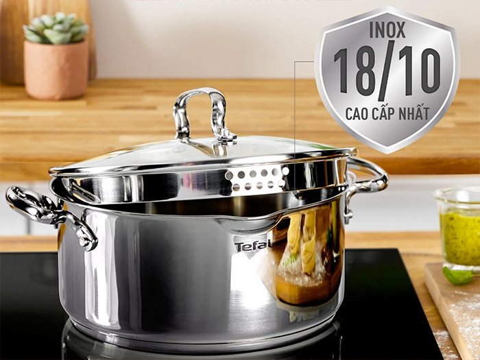 Nồi inox Tefal có các vạch đo lường dễ đọc bên trong đảm bảo việc nấu ăn chính xác với các tỷ lệ nguyên liệu. Tay cầm bên ngoài được tán đinh siêu bền giúp tăng cường việc an toàn sử dụng dài lâu.