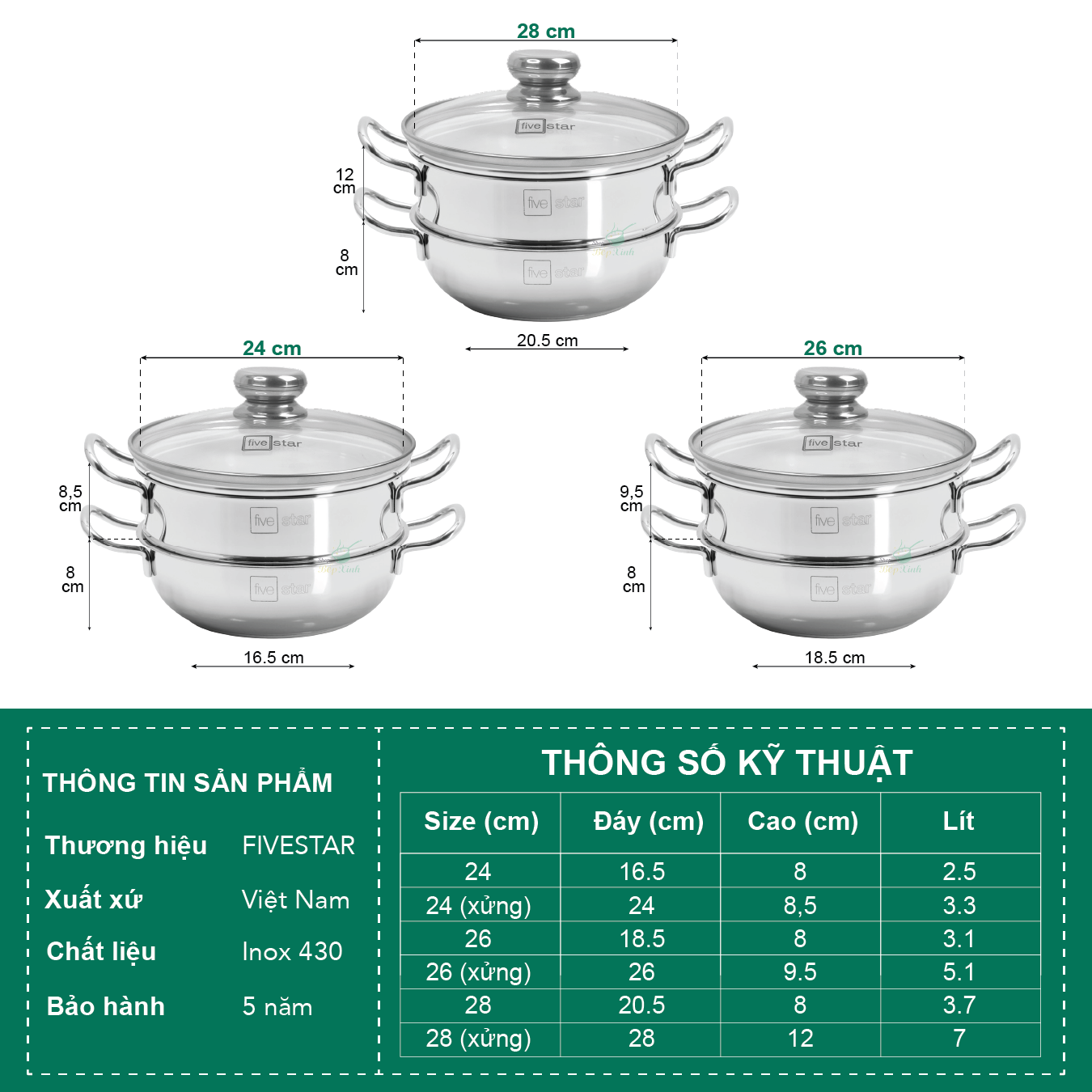 Kích thước: 1 nồi đường kính 24 cm, 1 xửng hấp đường kính 24 cm
