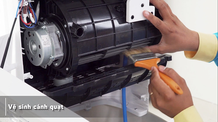Mô tơ quạt (quạt lồng sóc) là bộ phận khó lau chùi, lời khuyên là hãy sử dụng 1 cây cọ để quét bụi bẩn bám trên thân quạt và cánh quạt.