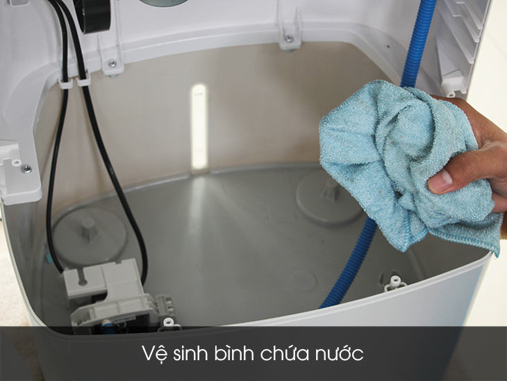 Bình chứa nước là bộ phận thường rất dễ bị bẩn, bám rêu mốc,... Chính vì vậy, bạn cần vệ sinh thật kĩ bình chứa nước bằng khăn ẩm, một số vị trí khó lau chùi bạn có thể dùng bàn chải lông mềm để vệ sinh.