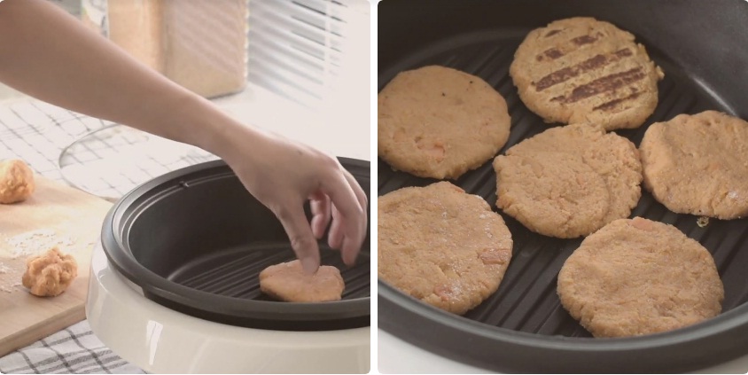 Cho bánh vào nồi chiên không dầu, ấn dẹt bánh ra và rán không cần dầu khoảng 2 - 3 phút rồi trở mặt bánh cho chín đều là được.