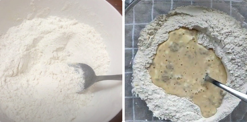 Sau đó bạn cho sữa tươi và lòng đỏ trứng gà vào hỗn hợp bột.