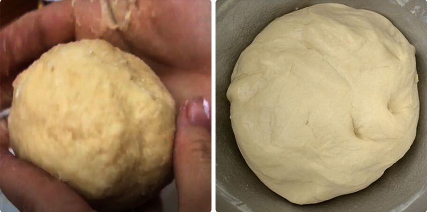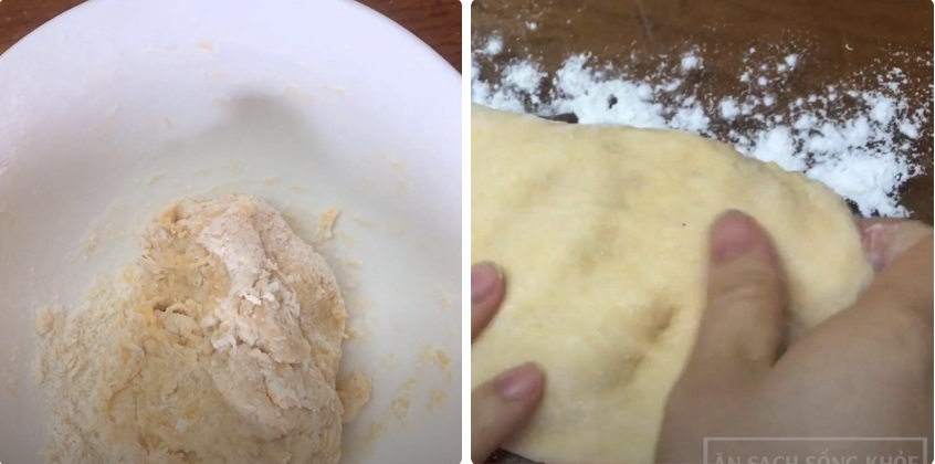 Dùng tay nhồi sơ cho bột kết dính lại. Sau đó bắt đầu nhồi theo kỹ thuật Folding and Strectching.