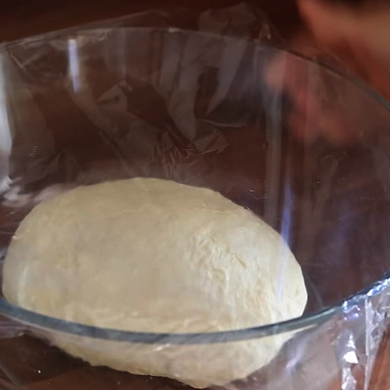 Cho khối bột vào tô, bọc kín bằng màng bọc thực phẩm và ủ khoảng 60 phút đến khi bột nở gấp đôi.