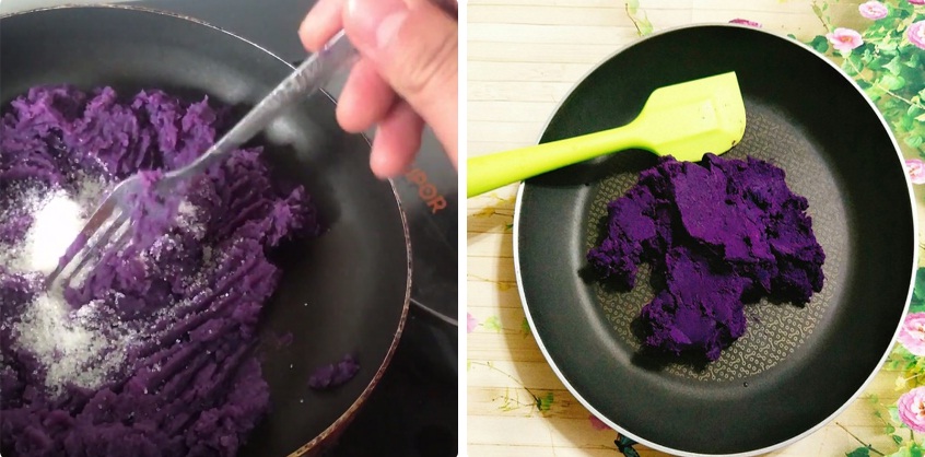 Bạn cứ sên cho đến khi khoai dẻo, quyện thành một khối không dính chảo mới tắt bếp.