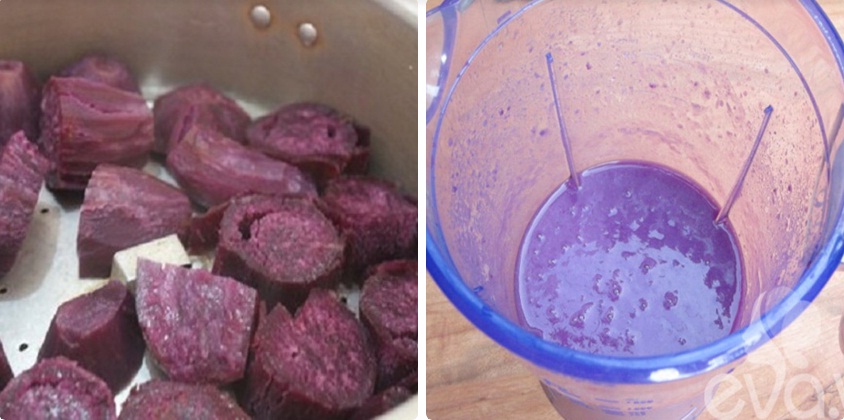 Khoai tím rửa sạch và cho vào nồi hấp chín, sau đó dùng máy xay nhuyễn khoai lang.