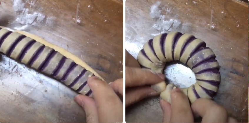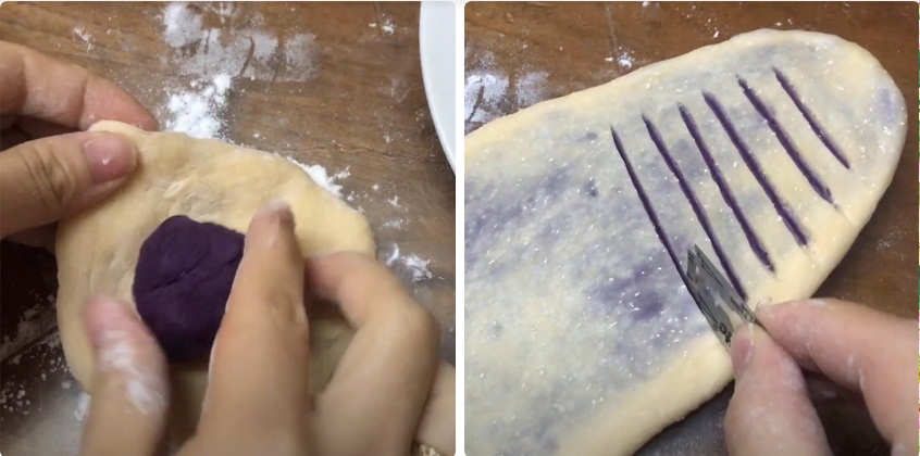 Bạn đè dẹp phần bột mỏng ra và cho nhân khoai lang vào giữa rồi vo tròn lại. Bạn cán dẹt phần bánh có nhân dài ra rồi sử dụng mũi dao cắt chính giữa phần bột lớp trên, cuối cùng cuộn bánh tròn lại nha.