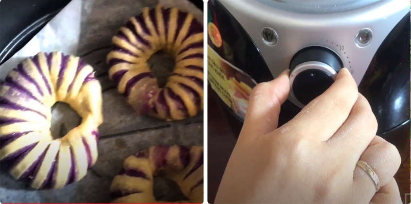 Quét 1 lớp trứng mỏng lên bánh trước khi tiến hành nướng. Bật nồi chiên không dầu ở 170 độ C trước 10 phút. Cuối cùng bạn cho bánh vào nướng 15 phút 170 độ C rồi lật mặt nướng thêm 5 phút ở 170 độ C là bánh chín nha.