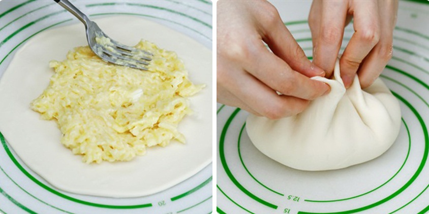 Cho nhân phô mai sầu riêng lên mặt bột, dàn đều và túm gọn mép bột lại.