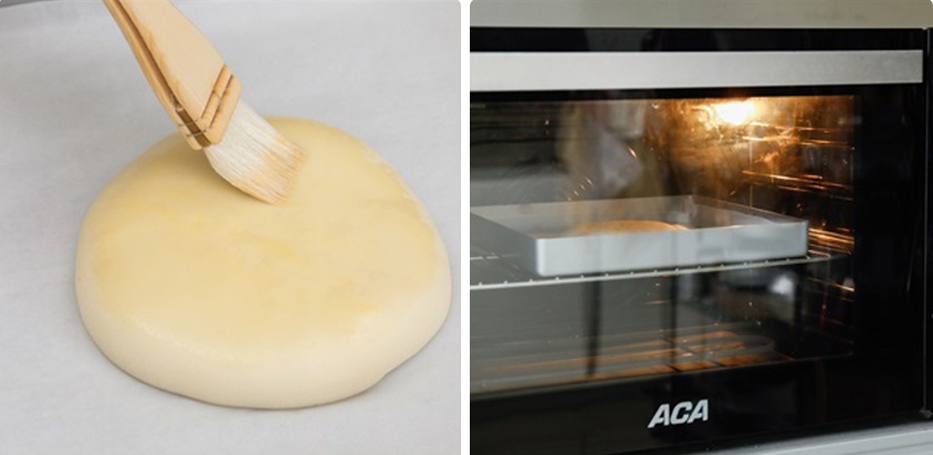 Dùng cọ phết một lớp mỏng lòng đỏ trứng gà lên mặt bánh rồi cho vào lò nướng ở nhiệt độ 190 độ C trong 15 phút. Khi mặt bánh có màu vàng cam là bánh chín.