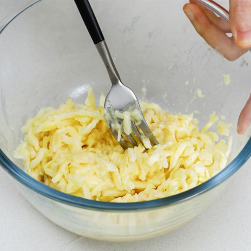 Cho vào tô 50gr phô mai mozzarella bào nhỏ, 50gr thịt sầu riêng rồi dùng nĩa tán nhuyễn cho hỗn hợn được hòa quyện.