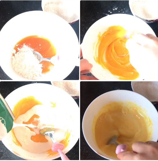 Cho vào tô 2 lòng đỏ trứng gà, 2 muỗng cà phê đường, 2 muỗng canh bột bắp. Dùng muỗng khuấy đều cho hỗn hợp hòa quyện.
