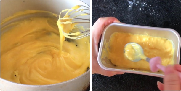 Áo khuôn bằng 1 lớp dầu ăn rồi cho hỗn hợp sữa vào. Sau đó, để vào ngăn đá tủ lạnh đến khi đông cứng lại.