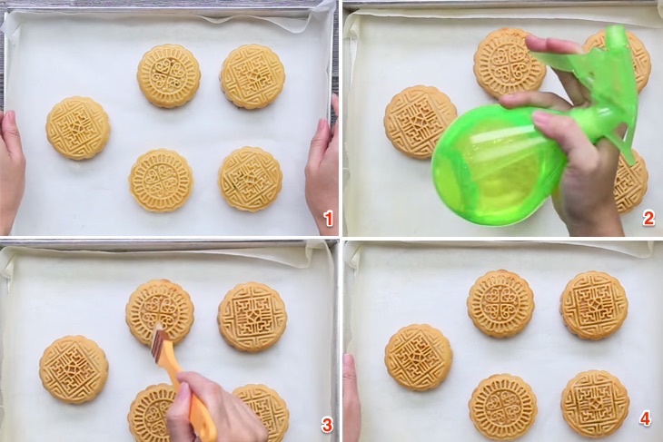 Nướng bánh lần 1 ở nhiệt độ 200 độ C trong 8 phút. Sau đó, lấy ra xịt nước để bánh nguội 15 phút, rồi phết một ít dầu mè lên bánh.