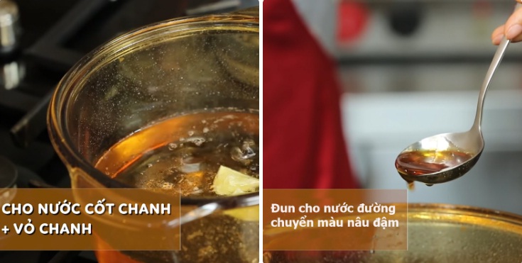 Sau khi nước đường đã sôi bạn cho vào 1 quả chanh đã vắt lấy cốt và vỏ chanh đun cho tới khi nước đường và vỏ chanh có màu nâu đậm thì tắt bếp.