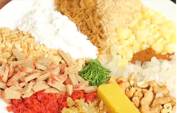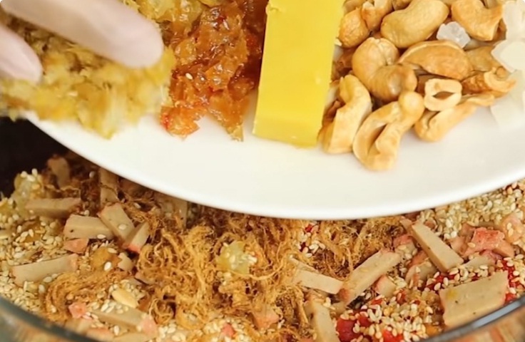 Băm nhỏ mứt sen, hạt điều. Tiếp đó, xắt nhỏ mứt chanh, mứt gừng, mứt tắc và xá xíu chay.