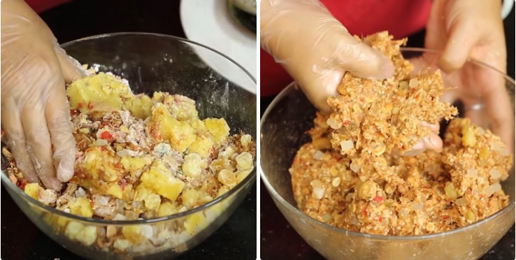 Cho toàn bộ nguyên liệu đã chuẩn bị theo định lượng bao gồm: đậu xanh, mứt gừng, mứt tắc, mứt chanh, 5 lá chanh (đã xắt nhỏ), ngũ vị hương, bột bánh dẻo, hạt dưa, hạt sen, hạt điều, hạt mè, chân nấm đông cô làm chà bông, xá xíu chay, nước tương, rượu mai quế lộ, rượu gừng, 20gr nước đường (đã nấu ở bước 1) vào tô và nhào trộn thật đều để nhân bánh được kết dính.