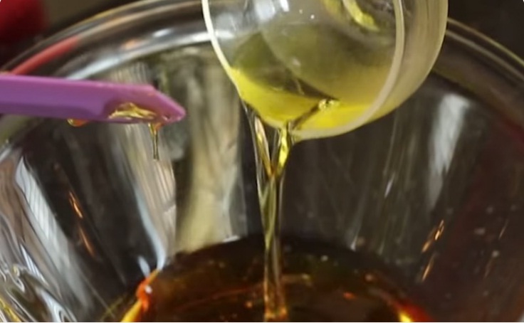 Cho vào tô 200gr nước đường (đã nấu ở bước 1) và 70gr dầu ăn trộn đều.