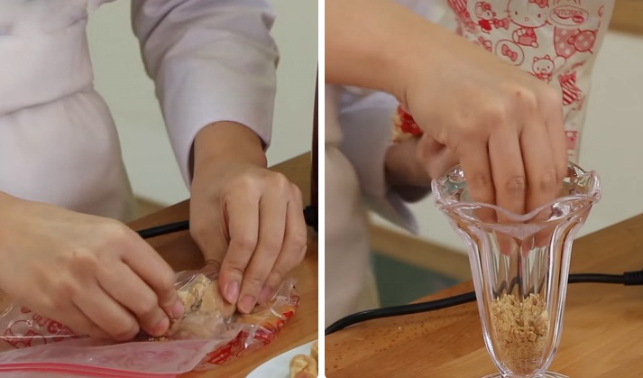 - Cho 3 chiếc bánh quy cracker (bánh quy giòn) vào túi zip rồi bóp hay đập vụn. Sau khi bánh nhuyễn, chuẩn bị 1 chiếc ly cao và cho vụn bánh vào khoảng 1/4 ly.