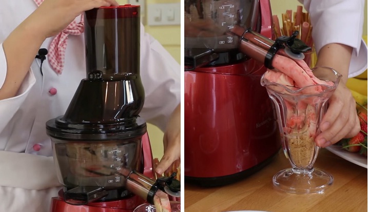 - Lấy dâu và chuối ra khỏi ngăn đông, tiến hành bật máy ép chậm, để ly ở miệng máy để hứng kem.