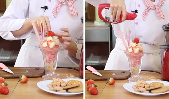 - Bạn có thể sử dụng thêm các loại topping kẹo marshmallow hay một vài cái bánh que vị dâu để ly kem thêm đẹp mắt nhé!