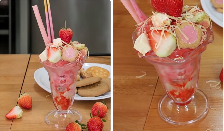 - Bạn xếp lên ly kem 3 trái dâu tây tươi, bào 1 ít phô mai lên trên rồi xịt thêm 1 ít siro dâu xung quanh là đã hoàn thành rồi.
