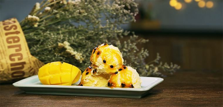Viên kem mát lạnh với vị ngọt thanh đặc trưng của xoài kết hợp cùng vị chua nhẹ của chanh dây. Đây đích thị là món kem dành cho những ngày hè oi ả.