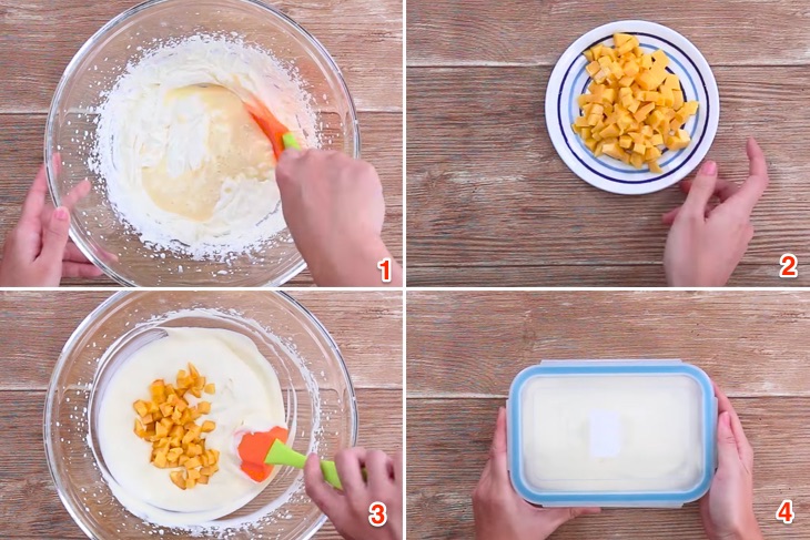 - Trộn xoài đã cắt hạt lựu vào hỗn hợp kem. Sau đó, cho vào hộp nhựa đậy kín rồi cho vào ngăn đá tủ lạnh trong 6 - 8 tiếng là có thể dùng được.