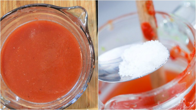 Cho cà chua vào máy xay sinh tố, xay nhuyễn cho đến khi có hỗn hợp mịn thì tắt máy. Lọc phần cà chua xay nhuyễn qua rây, dùng muỗng đè thịt cà chua cho ra hết nước cốt.